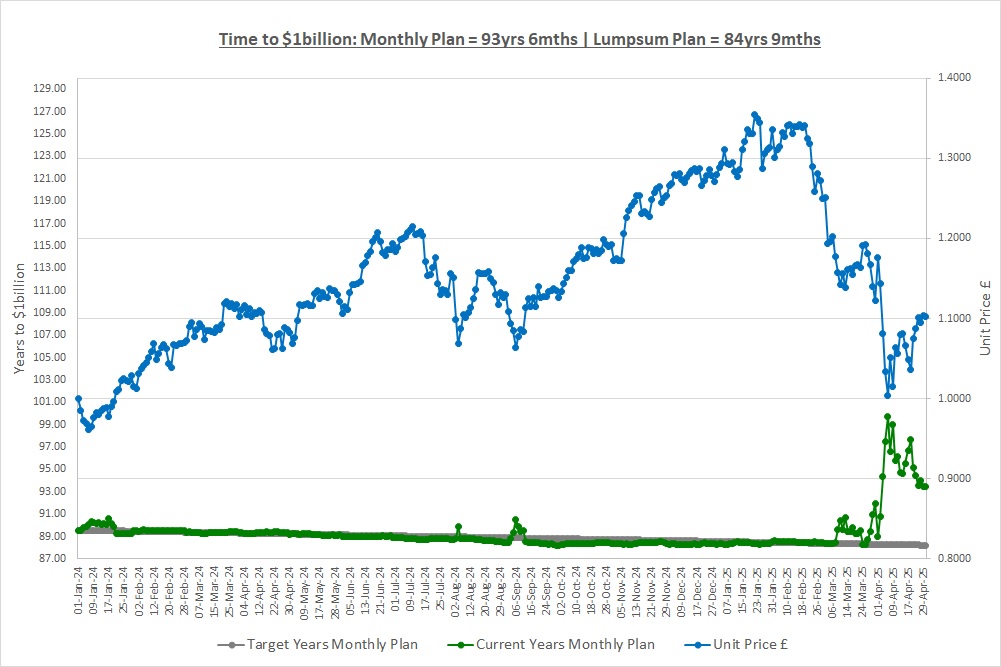 We are going to turn a saving of £50pm over 10 years, or a Lumpsum of £10,000, into $1billion over the next 80 – 120 years. That’s a return of 7,700,000%, yes, 7.7million percent! When there is panic in stock markets it’s easy to lose belief in what you are doing and a 25% loss can seem like a mountain to climb. Our mountain is 7,700,000%, not the current sell-off. The Monthly Plan started 16 months ago with no savings and we are building a solid financial base from month to month despite this sell-off and are developing the habits needed to become incredibly wealthy. The Lumpsum Plan is still up despite the sell-off and remember, last year when we were making a lot of money we said it would not continue and we would lose money at some point.